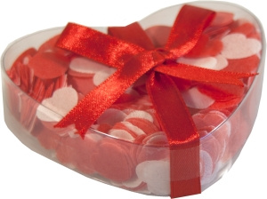 En hjärtformad och sidenprydd ask fylld med hjärtformade och väldoftande badkonfetti. De små hjärtana är färgade i vitt och rosa. Lägg dem i badkaret där de smälter och sprider en skön väldoft i hela badrummet.