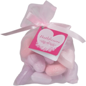 Små, söta, hjärtformade badbomber förpackade i en liten, rosa, genomskinlig tygpåse ihopknytet med ett ljusrosa sidenband.