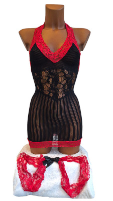 Black & Red Dress XS-M är en sexig och läcker miniklänning i delikat nättyg. I halterneck modell med spetskant upptill och nertill på klänningen. En vågad och het look som garanterat kommer smickra och få dig att känna dig speciell när den bärs. Det elastiska tyget anpassar sig efter din kropp för en utsökt passform. Ett spetsband med rosett medföljer som accessoar. Storlek XSmall-Medium.