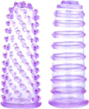 Du får två överdrag som har olika ytor, så att du får varierad stimulans. Träs på finger (eller smal stav) för att ge dig extra njutning. Kommer i lila eller rosa färg.