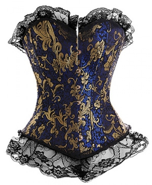 Axelbandslös korsett med guldmönster. Snörning i rygg. Stringtrosor medföljer. OBS: Färg svart/guld.
