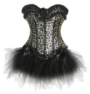 Leopardmönstrad, axelbandslös korsett med tillhörande tyllkjol och stringtrosor.