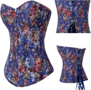 Axelbandslös korsett i bomull med knäppning fram och snörning bak. Färgen är blå med blommönster. Korsetten har insydda skenor för bästa passform.
