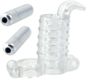 Detta överdrag är gjord i mjukt och flexibelt TPE-material. Det är knottrigt och försett med långa mjuka öron som under samlaget kittlar lite extra inuti vaginan. En vibrator upptill ger skön klitorisstimulans.
