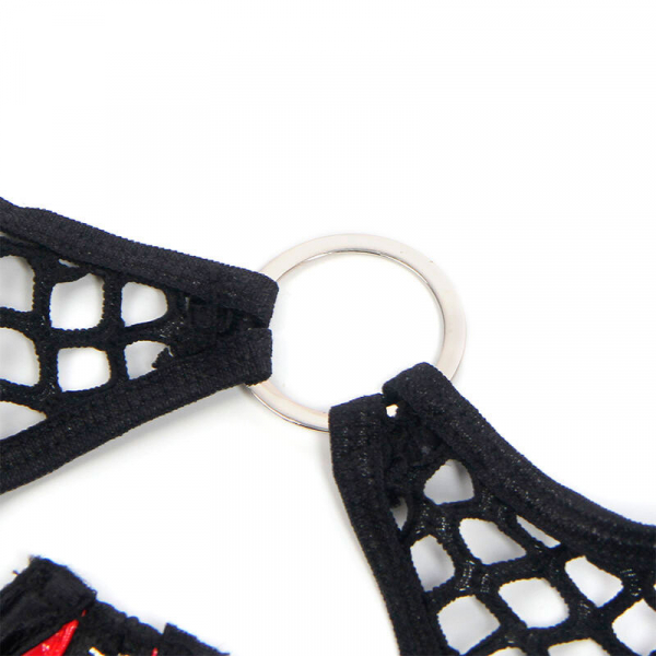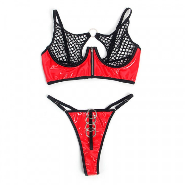 Hot Red s-m är ett sexigt underklädesset i glänsande syntetläder och förförisk mesh som kombinerar styrka och sensualitet. BH:n med frontdragkedja och strategiskt placerade meshpaneler skapar en lekfull balans mellan avslöjande och mystik, medan det elastiska materialet följer kroppens kurvor med komfort. Perfekt för dig som vill stå ut, väcka uppmärksamhet och känna dig både självsäker och oemotståndlig. Trosorna i matchande look. Storlek Small-Medium.