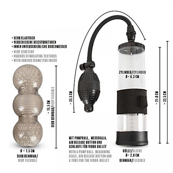 1 st potenspump - med behändig air-release på pumpblåsan(handkraft) och måttangivelse på cylindern. Cylindern är 21 cm lång och 5,5 cm i diameter. Tillverkad i hårdplast, PVC och sleeven i silikon.