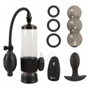 Man 7-dels Set är ett maxat leksaksset innehållande sköna och användbara produkter för honom. En potenspump och tre ringar för hårdare erektion, ett vibrerande ägg som kan sättas på pumpen eller användas separat, en vibrerande analplugg och en stimulerande stroker. Allt för att ge mesta möjliga njutning åt såväl penis som anal under solo- och parlekar.