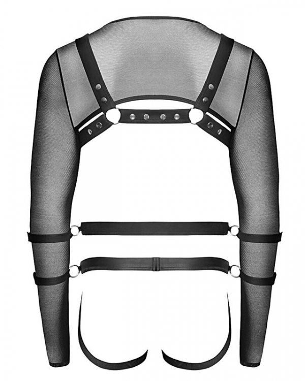 Mens Bondage Set L är ett utmanande 3-delat set som kombinerar stil och funktion för en tuffare look. Setet innehåller crop top med långa ärmar, justerbart chest harness samt en kalsong i jock-modell i powernet med öppet ryggparti. De mattsvarta detaljerna med tryckknappar, ringar och remmar skapar en rå och dominant look som verkligen sticker ut. Storlek Large.