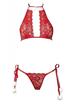 Merry Snow Angel Set är ett sensuellt och sexigt underklädesset. Den vackra röda spetsen och det snö lika vita fluffiga tyget i halsringningen ger setet en julig helhet. Toppen är öppen framtill med band som knyts i ryggen och nacken. Underdelen har spets framtill, är öppen baktill och har knytband i sidorna med vita fluffiga bollar i ändarna.