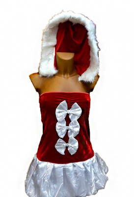 Axelbandslös klänning i kort modell. Tomteluva och stringtrosor medföljer.
