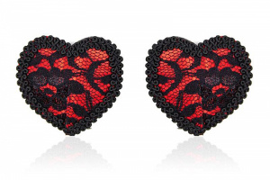 Nipple Covers Lace är ett par nipple pasties som främhäver brösten men döljer bröstvårtorna. Som en erotisk utsmyckning med hjärtformen, den svarta spetsen över den röda, skimrande bakgrunden och den svarta dekorbandet runt kanterna. Sensuellt och sexigt. Självhäftande baksida. 2-pack, passar de allra flesta i storlek. 5,5 x 5 cm.