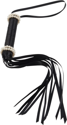 Denna piska är gjord av smala, svarta sidenband. Vita plastpärlor på handtaget ger piskan ett exklusivt utseende.