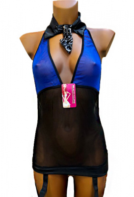 Klänning med strumpebandshållare, strumpeband, halskrage och stringtrosa.