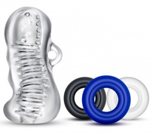 Quickie Kit är ett skönt kit för mannen innehållande en stroker och tre ringar. Strokern har en härligt knottrig och ribbad insida och en ögla utanpå som ger ett extra bra grepp. De tre potensringarna sätts runt roten av penis och bidrar till en hårdare och effektfullare erektion.