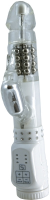 Denna stav i rabbit-modell är vit/genomskinlig med strass nertill. Den är gjord i hudvänligt TPE-material. Den har en rak utformning förutom att den har ett markerat ollon för att stimulera lite extra. Klitorisretaren är utformad som en kanin, med mjuka långa öron.