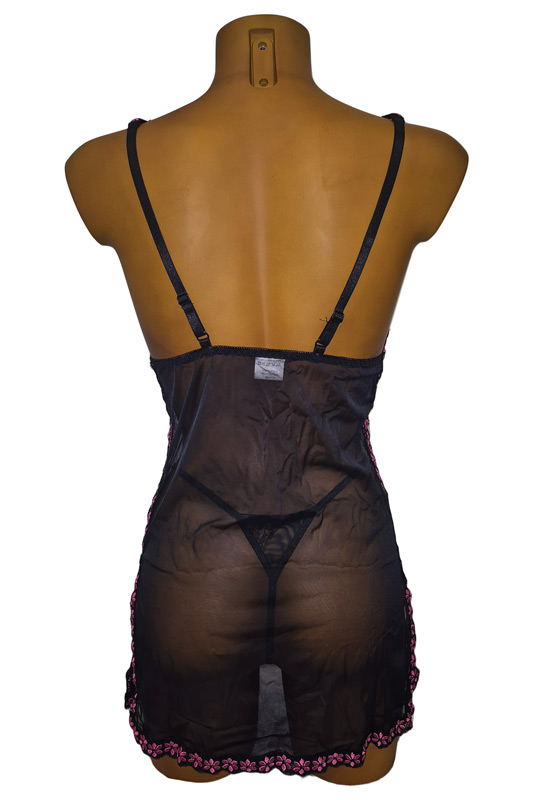 Ramlah L-XL är en sexig negligé med utsmyckande detaljer. Gjord i skirt material som gör att huden och formerna syns igenom. Runt kanterna och på axelbanden är det rosa blommor broderade och i urringningen sitter en rosett med strasshjärta. Axelbanden är reglerbara så att de kan justeras till önskad längd. Ett par stringtrosor medföljer. Storlek Large/XLarge.