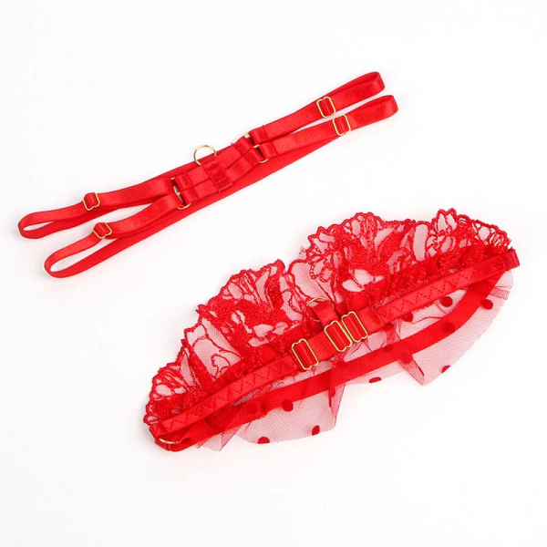Det som medföljer är 1 st BH, 1 st trosor, 1st höfthållare och 2 st strumpeband (varav ett strumpeband med spets).