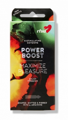RFSU Power Boost är kondomen med extra allt. Den kan förstärka erektionen, ge ökad sexuell njutning och en mer intensiv känsla för båda. En kondom med knottror och räfflor för mer stimulans. De är glidmedelsbehandlade och innehåller aminosyran L-Arginin, ett naturligt ämne som finns i kroppen och som bevisat ökar blodcirkulationen.