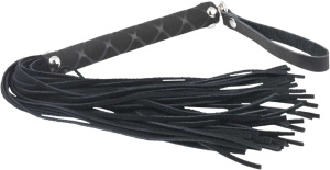 Denna piska är gjord i mjukt mockaskinn och har silvernitar på handtaget. Den har ett rejält handtag med en ögla längst upp.