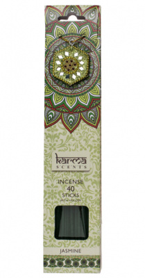Rökelse Jasmin är ett set med 40 st rökelsepinnar och en dekorativ hållare. De är gröna till färgen, har doft av jasmin och är 26 cm långa. Hållaren hänger prydligt på förpackningen, är 4,5 x 4,5 cm stor, har plats för 7 st rökelsepinnar och är glittrande grön.