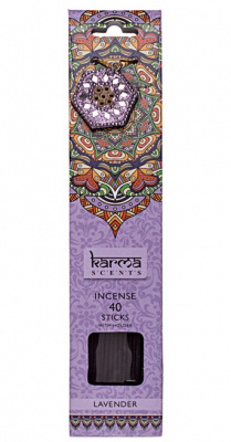 Rökelse Lavendel är ett set med 40 st rökelsepinnar och en dekorativ hållare. De är lila till färgen, har doft av lavendel och är 26 cm långa. Hållaren hänger prydligt på förpackningen, är 4,5 x 4,5 cm stor, har plats för 7 st rökelsepinnar och är glittrande lila.