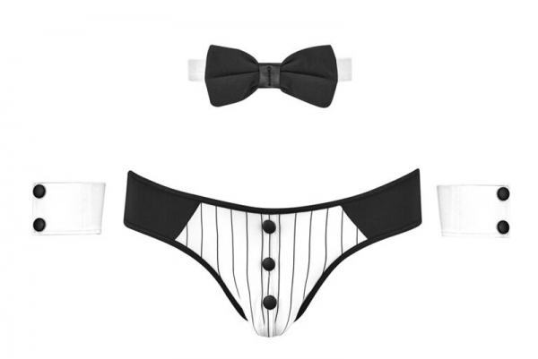 Serve Pleasure Set L är ett sexigt set i butlerstil. Outfiten som gör dig till en sexig betjänt, bestående av ett par kalsonger, handledsmanschetter och en fluga. Kalsongerna är i ett mjukt och behagligt material och är öppna baktill så man får sig en titt på skinkorna. Knapparna framtill är enbart för syns skull och är ej öppningsbara. Handledsmanschetter och fluga har kardborreknäppning. Perfekt set för njutningens tjänare! Storlek Large.