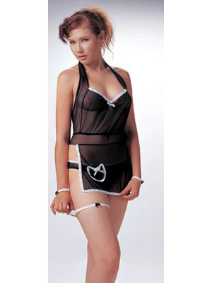 Set hembiträde - förkläde, trosa, två spetsarmband och ett strumpeband. One size