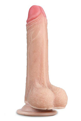 Sliding Skin Dong har en len och detaljrik hud på ollon, skaft och pung som ger känslan av den äkta varan i erigerat läge. Den är tillverkad i materialet TPE och har ett par fasta kulor vars textur har stor naturtrogenhet. Den har en avtagbar sugpropp som bas, så att du kan välja om du vill njuta och använda den med eller utan sugpropp. Sugproppen skruvas enkelt av och på.