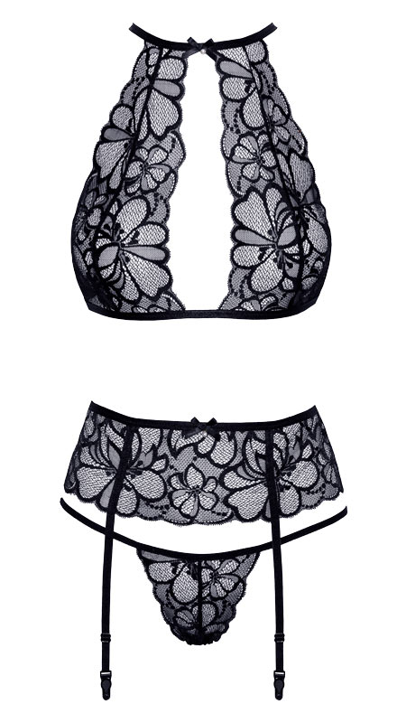 Soft Set S-M är ett tilltalande och sofistikerat underklädesset med mjuk BH, trosor och höfthållare. Setet är i spets med sensuellt blommönster. Smyckat med rosett och liten gnistrande pärla på topp och trosor. Trosorna är av stringmodel. De är mjuka och stretchiga materialet för hög komfort. BH:n stängs med hyska i nacke och rygg. Storlek small-medium.