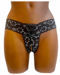 Thong Open M-L är en vakcer spetstrosa med öppen gren. Den dekorativa spetsen är svart med silvriga detaljer och en snygg korsettsnörning framtill (endast som detalj). Den öppna grenen är perfekt för eggande lekar där man önskar få full tillgång till de mest intima delarna. Storlek Medium/Large.