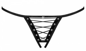Här är en fräck och tuff trosa i storlek L-XL. Det är en sensuell stringtrosa med remmar fram till. Trosan är gjord i stretchiga band och framsida är dekorerad med metallringar placerade på sammets material, i ringarna löper elastiska remmar som fångar blicken.