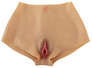 Vagina Pants L med en naturtrogen vulva och integrerad vagina. Mycket realistiskt utseende med navel, rumpveck och en stretchig anusöppning som fulländar den verklighetstrogna looken. Den öppna vaginan är behagligt stretchig och försedd med stimulerande knottror och textur för extra känsla.