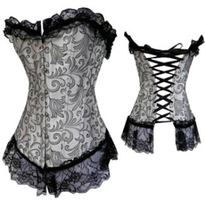 Axelbandslös korsett i skimrande grå nyanser och svart spets. Stringstrosor medföljer.
