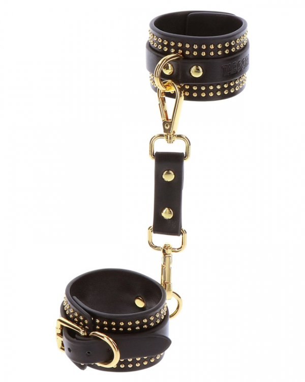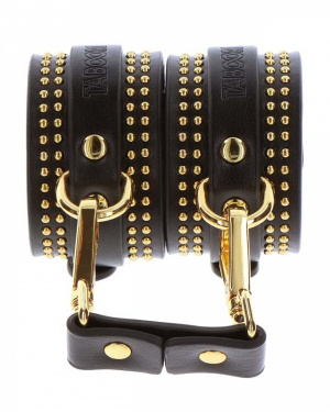 Vogue Ankle Cuffs är ett par eleganta vristfängsel i svart veganskt läder med blanka gulddetaljer. De är designade för er som vill utforska bondage med glamour och sensualitet, där varje detalj utstrålar lyx och passion. Den nickelfria guldiga metallen och de många små guldnitarna ger ett visuellt tilltalande intryck. Materialet är mycket mjukt och behagligt mot huden.