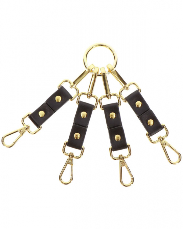 Vogue Hogtie är 32 cm lång och består av fyra remmar med karbinhakar som kopplas ihop i en gemensam ring. Den eleganta konstruktionen gör den perfekt för dig som vill utforska bondage med både stil och intensitet. Hand- och vristfängsel köps separat.